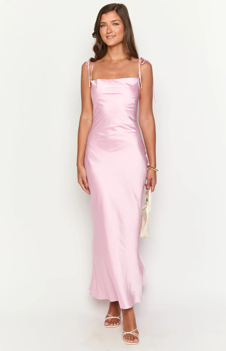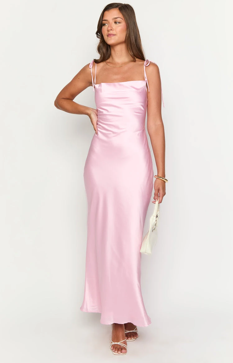 Our Antoni Light Pink Cowl Neck Satin Maxi Dress is a stunning choice for any formal occasion! With its flattering bias cut, slight cowl neckline, and adjustable tie straps, this dress ensures a perfect fit while exuding effortless elegance. Complete the look with strappy heels and gold jewellery for a chic and playful vibe at prom or a special evening out!