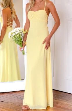 Radiate elegance and charm in our Arabelle Yellow Chiffon Lace-Up Maxi Dress – the perfect statement piece for weddings, proms, or formal celebrations! The soft chiffon fabric flows beautifully with every step, while the gathered bust and lace-up back add a delicate, romantic touch. Style it with gold jewellery, strappy heels, and a soft clutch for a graceful, sunshine-soaked look that’s sure to turn heads.