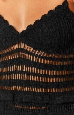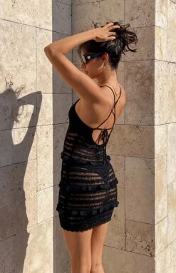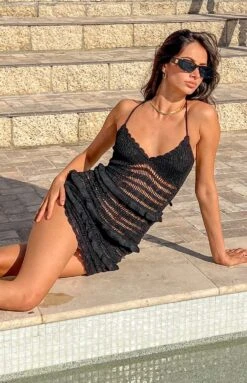 - This is a perfect black knit vacation mini dress. The Ausha Black Knit Mini Dress features ruffled detailing and thin straps that cross tie at the back! Pair this dress with a beautiful pair of black heels and a classic black bag!