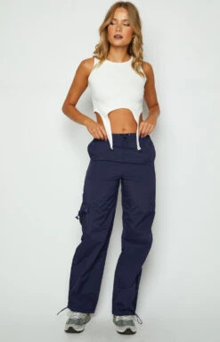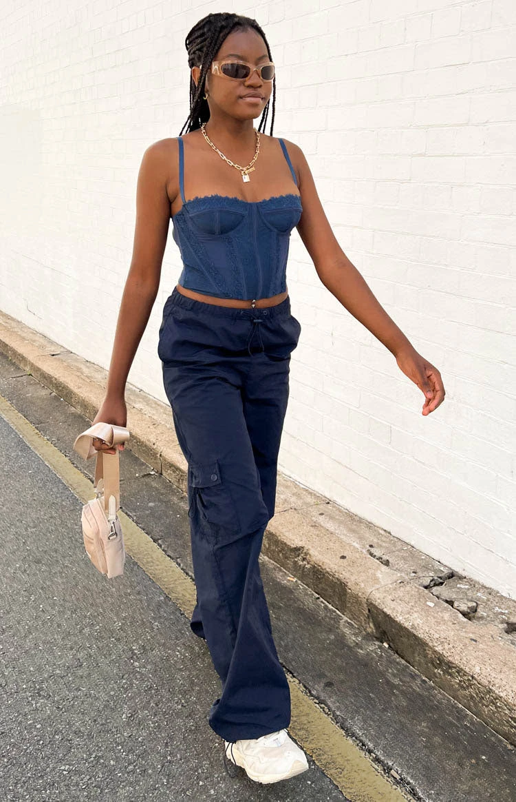 - Y2K in these navy cargo pants. Perfect piece for an everyday street look. Style with a crop and sneakers for ultimate comfort and style. Be sure to pop on sunnies and a bag to complete this fit!