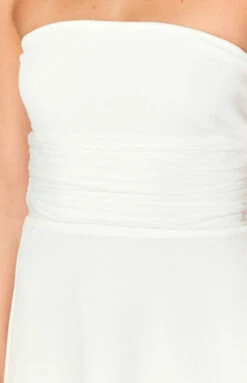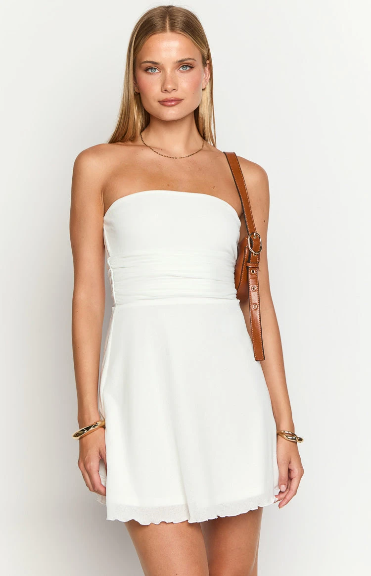 Get ready to turn heads in our Benji White Strapless Mini Dress! With its flattering gathered waist, stretchy fabric, and supportive gel grip, this dress hugs your curves and moves with you. The mini length and fun lettuce trim hem give it a playful edge, simply pair with sleek heels and a statement necklace for an elegant night out look!
