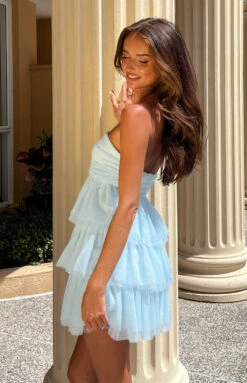 This stunning blue mini dress is the perfect show stopping party outfit. With the beautiful tulle detailing this strapless mini dress will make heads turn and all eyes on you