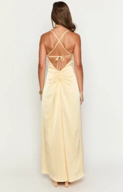Our Blaise Yellow Satin Maxi Dress is all about luxury and elegance, with its straight neckline and romantic open back with lace-up details! Crafted from luxe satin, it’s perfect for cocktail parties, weddings, or any formal event! Pair with strappy heels and minimalist jewellery for a sophisticated look.
