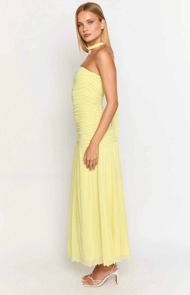 Step into Old Hollywood glamour with the Brayan Yellow Maxi Dress! With flattering ruching and a matching neck scarf, this dress exudes timeless elegance. Whether you’re heading to a cocktail party or a formal event, pair with kitten heels and gold earrings for the perfect chic finish.