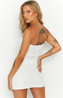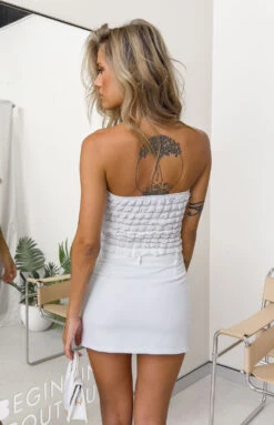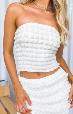 - Simple yet so versatile in this white boob tube crop! Dress this piece down with denim shorts and sandals or dress it up with the matching mini skirt and heels.
