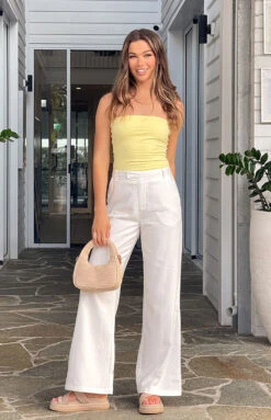 Elevate your style with our linen blend pants. Perfect for a night out with the girls or a chic business day, these pants offer both style and comfort. These neutral creamy beige-toned bottoms pair well with a basic white top and gold hoop earrings!