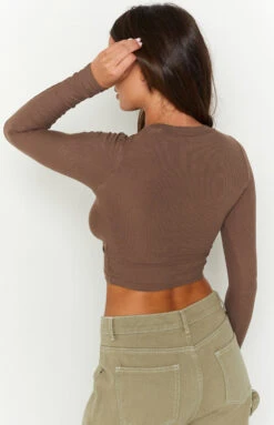 - Elevate your basics collection with this mocha cropped long sleeve top. Love the cut out detailing and how effortless this piece is. Add cargos and sneakers for an everyday look.
