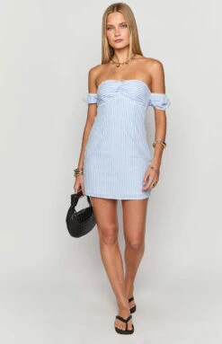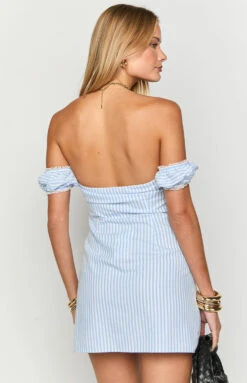 Blue Striped Off Shoulder Mini Dress