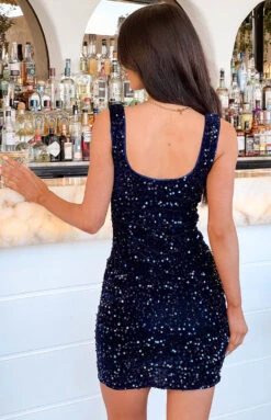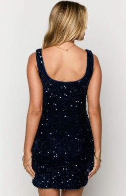 Make a statement in our Navy Sequin Mini Dress. Perfect for any special occasion, this dazzling dress will ensure you stand out in style. Pair it with clear high heels and a matching bag for a glamorous party look. Finish with delicate silver jewellery and you’re ready to shine!