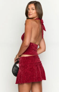 Add a pop of colour to your wardrobe with our Clancy Red Velvet Mini Skirt! The stretch lace, velvet detailing and flowy skirt makes for a charming and feminine closet essential! Â Pair with the matching Clancy Red Velvet Crop Top and a bold lip for your next night out!