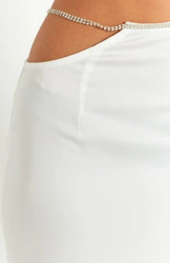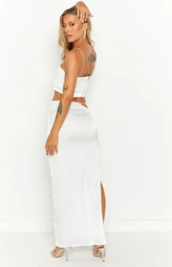 Look no further for your summer celebration outfit! This stunning white satin midi skirt with silver detailing on the waistband is so glam and classy! To elevate the look, pair with the matching Confetti White Crop Top and some simple heels.