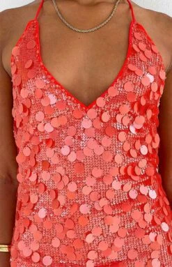This gorgeous orange sequin mini dress is perfect for your next cocktail event! Style with heels and a small shoulder bag for that sexy look!