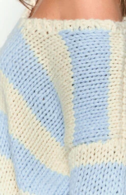 Add a pop of colour to those winter days with our Delvey Light Blue Striped Knit! The gorgeous baby blue stripe pairs perfectly with white linen pants and sneakers for an elevated comfy look. Styling options are endless in this versatile silhouette, wear on one shoulder and accentuate the wider neckline with your fave necklace to finish!