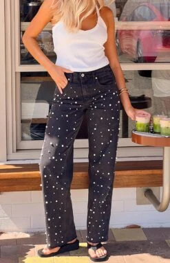 The perfect combination of classic and trendy is our Denim Dazzle Pearl Black High Waisted Jeans! This style transitions seamlessly from day to night with its embellished pearl-detailing on the front, high rise and straight leg fit! This look goes perfectly with a long sleeve top and jacket for a winter event or a crop top and heels for a summer night out!