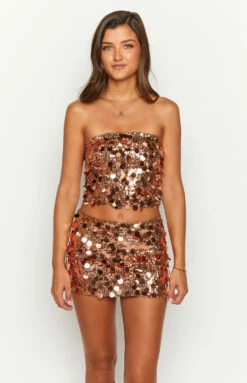 Never miss a chance to stand out in the Emiko sequenced crop top, the perfect top to make heads turn at a party. Pair this beautiful bronze crop top with the matching Emiko bronze skirt or mix it up with some basic white pants and sneakers to create an effortless but confident look.