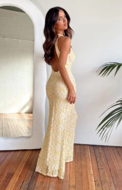 Our best selling lace maxi dress is here in our favourite summer yellow print! Add life into your wardrobe with this stunning piece – perfect for a formal event or wedding.