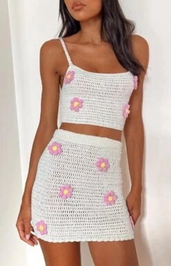 - Our gorgeous white crochet cropped top will be your new go to for beach day! Make sure to pair it with the matching crochet mini skirt or denim shorts to complete this beachy-vibe look. Put a bikini under it and you are ready for your beach day.