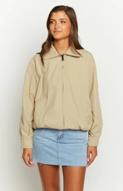 Feel like the ultimate cool girl in our Gabbi Fawn Windbreaker bomber jacket. Elevate your look with a white crop top, mini skirt and loafers.
