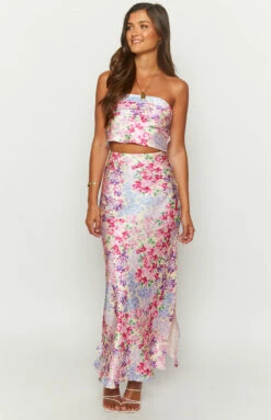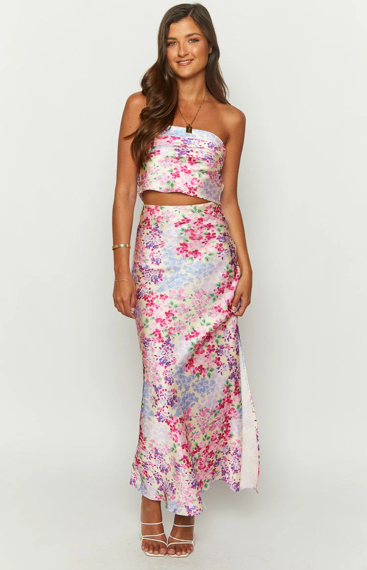 We are IN LOVE with this new print in our popular Genevieve maxi skirt! Complete the set with the matching top and white heels, perfect for your next event.