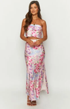 Our popular Genevieve top now comes in this stunning floral print! The most chic set for an upcoming birthday or wedding event! Complete the look with the matching skirt and white accessories!