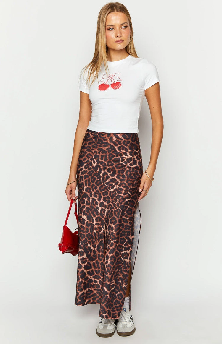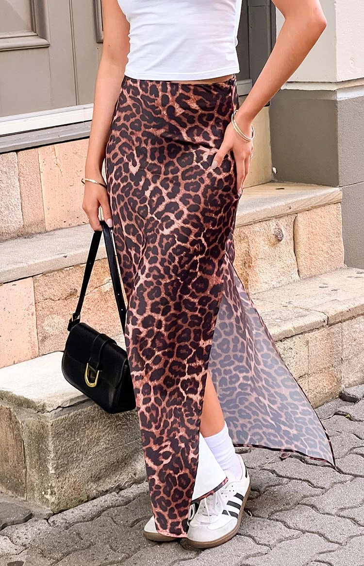 Get ready to turn heads in our leopard print maxi skirt. Style it with white graphic tee and sneakers for a laid-back look, perfect for a casual day out or a night on the town. For a more dressed-up vibe, style it with a black crop top and strappy heels!