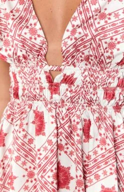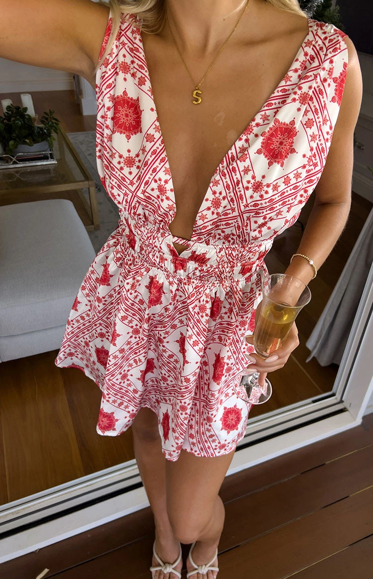 Steal the spotlight in our stunning Genovia Red Tile Print Mini Dress, featuring a daring plunging V neckline and a playful open back. The flowy skirt adds a touch of flirtiness, making it perfect for summer picnics or nights out with friends! Elevate your look with heels and gold jewellery and make a statement in this effortlessly chic dress!