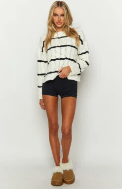 - A basic sweater is perfect for the cooler weather and easy to throw on! This cable knit jumper is perfect and goes with any denim or plain bottoms. We love the delicate stripe print mixed with the cable design. Style by tucking it in for a cropped look with jeans and sneakers or leave untucked with basic black bike shorts. Wear this for running errands or a lunch with friends!