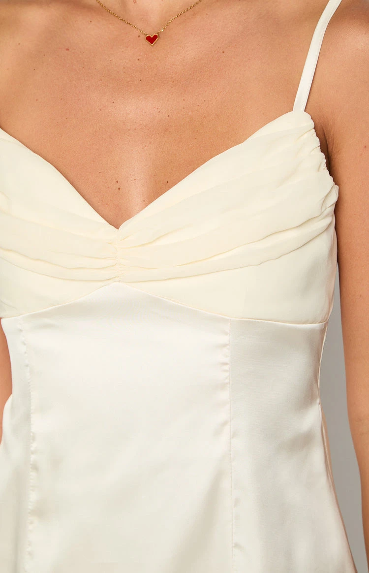 Our Honey Cream Mini Dress is truly an angelic piece, with a unique combination of stunning satin and chiffon fabrics! The thin adjustable straps ensure a comfortable fit, while the satin material exudes elegance, making it perfect for your homecoming or birthday event. Pair it with black heels and gold jewellery to channel golden girl energy!