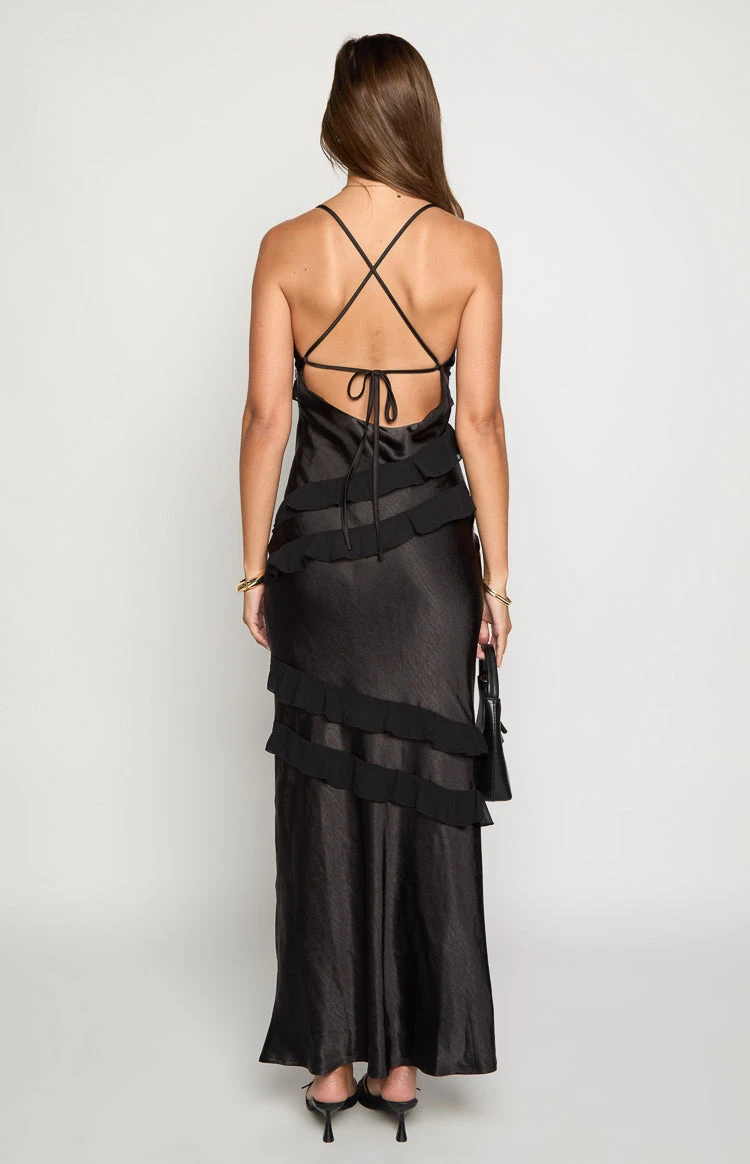 Our Inara Black Ruffle Maxi exudes sophistication and is perfectly crafted for your next formal or cocktail event! The V-neckline and lace-up adjustable straps create a flattering fit, while the chiffon ruffle detail adds a luxurious texture contrast. Style it with statement heels and drop earrings for an outfit that will leave jaws dropping.