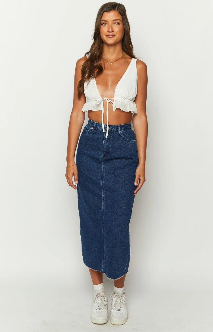 - Our stunning dark wash denim midi skirt can be dressed up or down! Pair this skirt with a stunning white off the shoulder top and a pair of white heels to show up and show out at a stunning brunch with the girls or to dress more casual wear a white or black cami and sandals with a shoulder bag and gold jewellery for an effortlessly chic look!