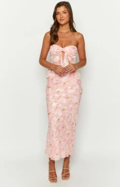 Look divine in this pastel pink floral strapless top. When styled with the matching skirt it makes the perfect set ensemble. Go for a more causal look and pair with a denim mini skirt and sandals.
