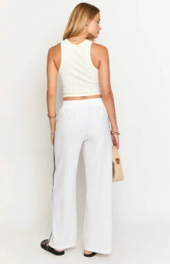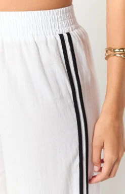 Our Jenner white linen blend contrast pants are a perfect blend of style and comfort! The black contrast stripes down the sides add a sleek, sporty touch, while the elasticated waistband ensures a relaxed fit. Pair them with a linen top and sneakers for an effortlessly cool look!