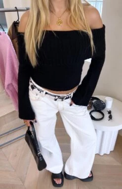 For the perfect blend of cozy comfort and a sophisticated silhouette, look no further than our Joey Black Off Shoulder Sweater! Featuring a soft stretch knit fabric and long flare sleeves that will keep you warm all season long! Â Its classic off-the-shoulder design pairs beautifully with your favourite pieces! For a warmer day, pair with a sophisticated mini skirt, sleek belt, and short mules that make for a chic ensemble. On a cooler day, pair with fitted pants and layer with a jacket to stay extra warm and cozy!Â