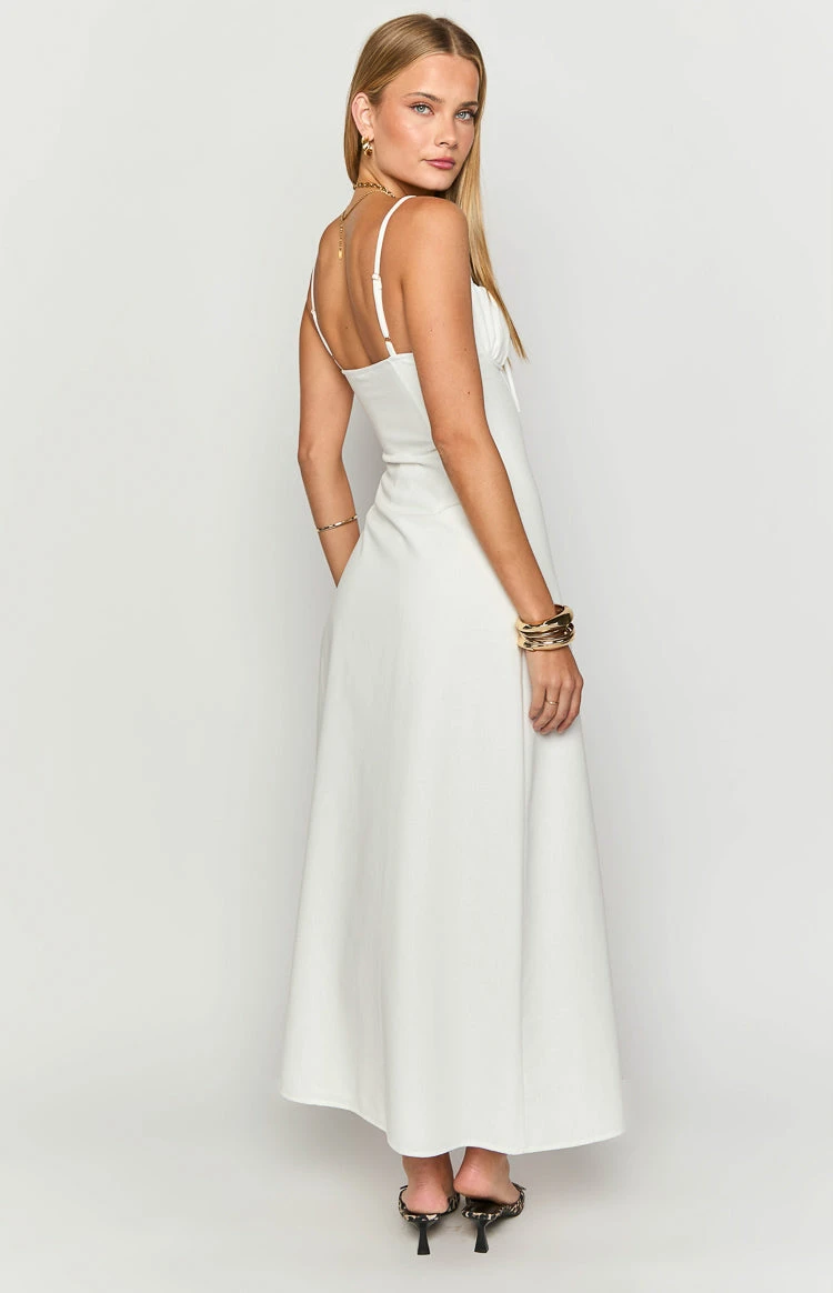Dreamy and delicate, our Kayla White Maxi Dress is ready for your special moment! The subtle tie-front detail adds a touch of romance, while the clean lines keep it modern and fresh. Elevate the look with strappy heels and a delicate clutch, or layer it with a linen blazer for a polished daytime ensemble. This dress is the perfect blend of understated elegance and feminine charm!