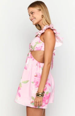 Embrace playful elegance in our Kyla Pink Lilly Print Mini Dress. The sweet cut-outs, plunging V-neckline, and fluttery ruffle sleeves create a feminine, flirty silhouette that’s perfect for making an entrance. The flowy skirt adds a whimsical touch, making it an ideal choice for birthdays or a dreamy summer picnic. Pair with delicate heels and a chic shoulder bag for a look that’s effortlessly enchanting.