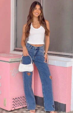 The Lover Girl Mid Wash Denim Mid Rise Jeans will add a touch of sparkle to your denim collection! Featuring cut-out heart details with diamante borders, these jeans are adorable in every way. Pair with a simple tee for a relaxed look, or dress them up with a crop top and heels for a fun, statement-making outfit. Perfect for those who want to mix classic denim with a little extra flair. No matter where you’re headed, these jeans will have you turning heads and sparkling!