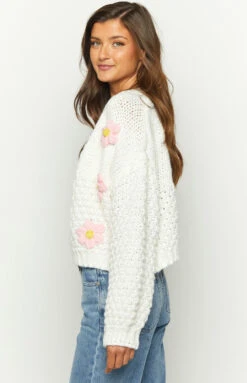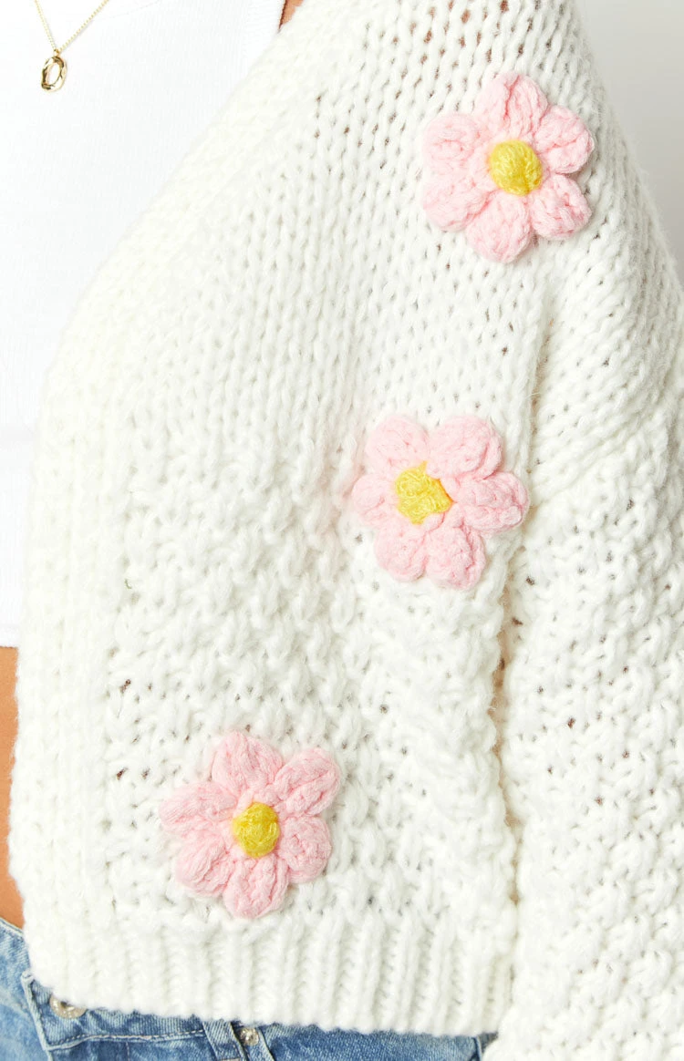 Snuggle up this winter in our white flower knit cardigan. We absolutely adore this comfy and casual everyday look when paired with jeans and slippers.