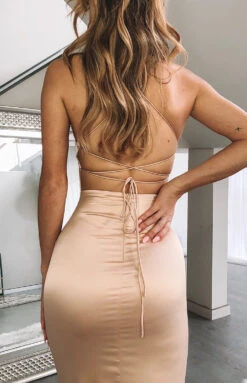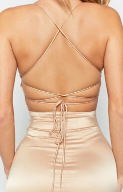 You deserve bottle service all night in The Manhattan Slip Formal Dress in Champagne! Form-fitting and sultry this slip is completed with sexy features like the lace-up back and knee-high leg splits on either side. Gold eyelets tie together the glimmering silky finish of the light fabrication, whilst the thin strapping gives the slip an ethereal feel! Accessorise with some glamorous gold jewellery and step into the night in a pair of nude heels to match!