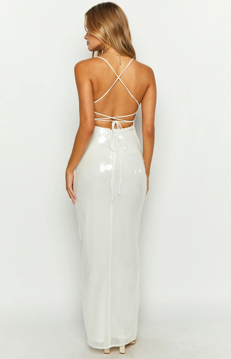 Dress to impress at your next formal occasion with this new-season take on one of our best sellers, The Manhattan. Style this sequin maxi dress with white accessories for a monochromatic look! Bring the bling with a dainty gold jewellery.Â