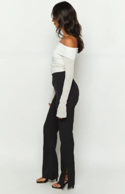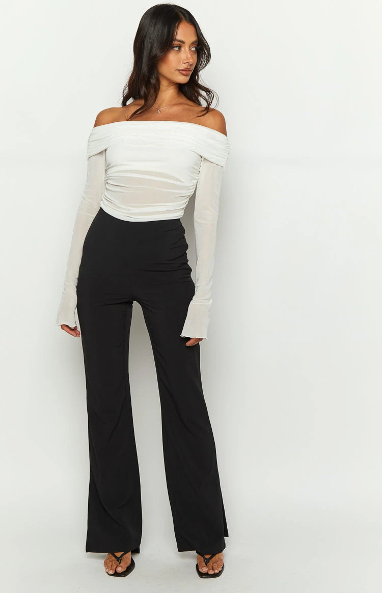 - A modern take on the classic tailored pant. Elevate any look day or night, whether it’s a white tank or corset. With a subtle flair and side slit, these sleek pants pair perfectly with heels.