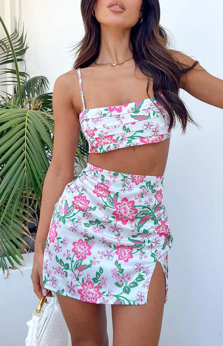 Looking for perfect floral mini skirt for your spring wardrobe? Simply pair with gold jewellery, a shoulder bag, the matching top or white crop top to complete the look!