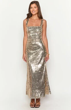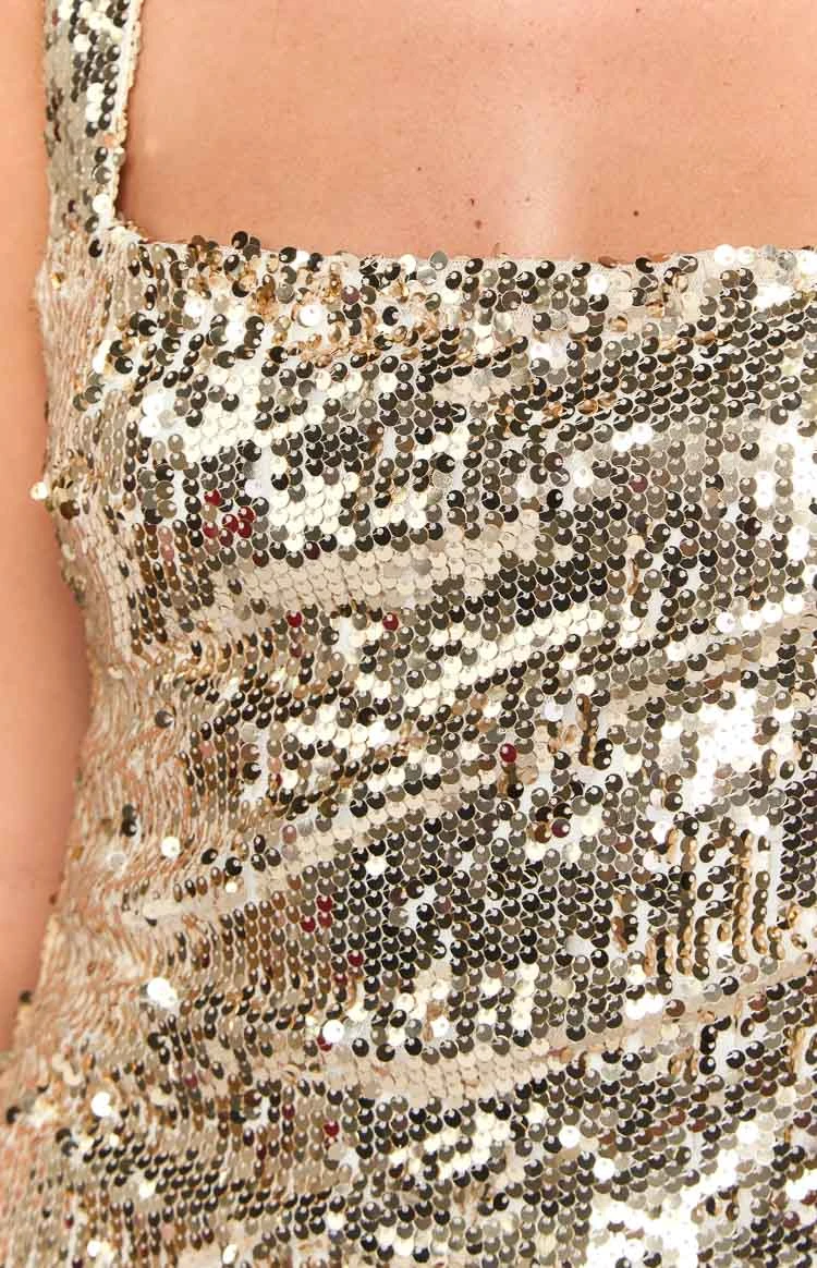 Be the centre of attention with our stunning Mirror Gold Sequin Maxi Dress! Featuring a fully lined stretch material with sequin embellishments and a sophisticated square neckline and open back design, this formal dress has the perfect balance of sophistication and star quality. Pair with simple strappy heels and soft waves in your hair to let the dress take centre stage!