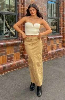 - The cutest tan maxi skirt perfect for your next winter night out! We love to pair it with a white crop top and silver jewellery for a cool girl vibe – so chic! Or style with a black crop and heels for a dinner outfit you’re sure to love.