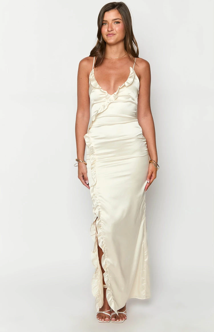 Cream Satin Ruffle Maxi Dress