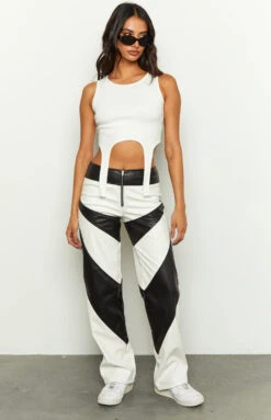- Stand out at your next festival with our PU contrast pants. Style with any white crop top and black boots to complete the edgy and slick vibe.