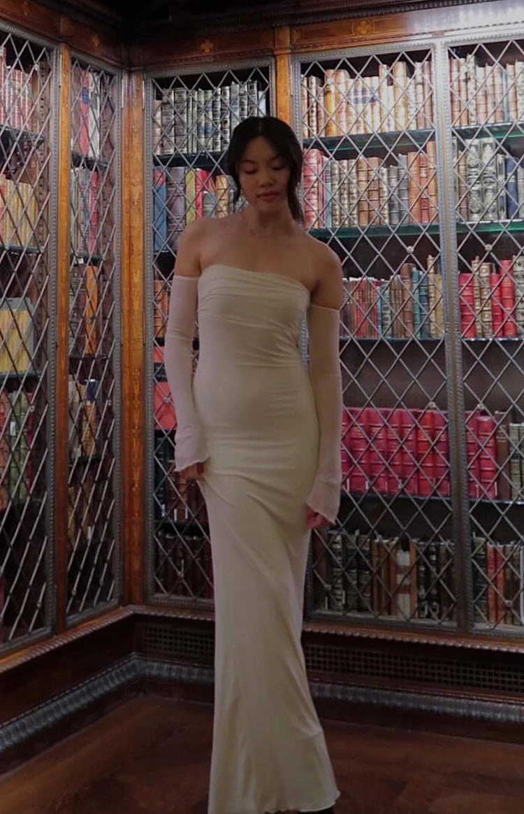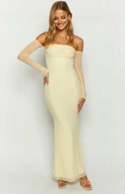 Bring the elegance to your next formal event in this stunning maxi dress! The strapless style, mesh long sleeves and figure-hugging fit is bound to make you stand out in a crowd. Complete this glam look with heels and gold jewellery.