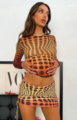 - We’re obsessing over this totally gorg print! This orange mini skirt can be worn with a white crop and sneakers for a relaxed look or style with the matching OMIGHTY Illusion Mesh Top 001 Orange for a cute two piece set!