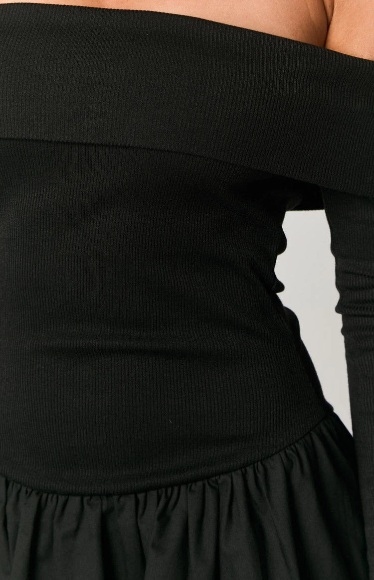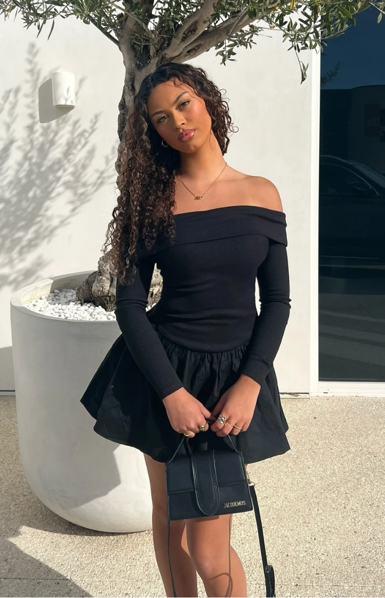 This gorgeous black long sleeve mini dress is elegant, classy and stylish! Featuring an off shoulder long sleeve style, this dress will keep you warm through out the night. Get ready for a dinner date or drinks by styling with pointed heels and a cute mini bag!