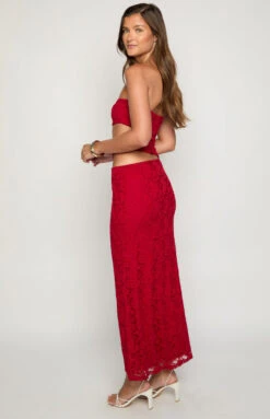 Perfect for your next formal event, our Rae Red Strapless Maxi Dress exudes elegance and sophistication. The stunning stretch lace material enhances your silhouette, while the side cutouts add a unique, flattering detail that boosts your confidence. Pair with black heels and a matching black clutch to turn heads at your next evening event!