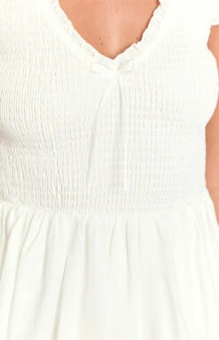 Our Raldo White Playsuit is the perfect mix of charm and comfort for casual, everyday wear! The shirred elasticated bodice and ruffle details on the neckline and sleeves add a playful touch, while the V-neckline with a ribbon bow creates a feminine silhouette. Ideal for brunch or a day date, simply pair with gold jewellery and sandals for an effortless, relaxed look!